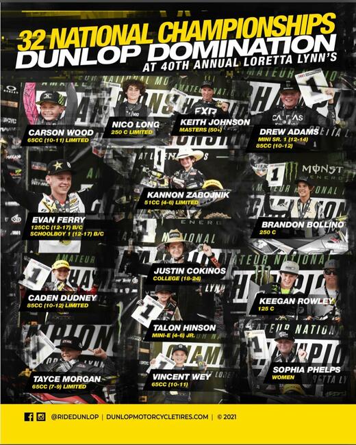 Rancho Cucamonga, CA: Dunlop riders at this year’s 40th running of the Monster Energy AMA Amateur National Motocross Championship at Loretta Lynn’s won 32 out of a possible 36 titles. That continues to give Dunlop a win record at Loretta’s nobody can touch: In the past eight years, Dunlop riders have won an incredible 94% of the possible championships at Loretta’s—including winning every title two years in a row.