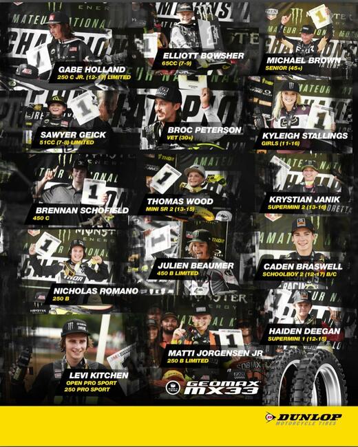 Team Dunlop Elite riders took home four championships and Team Dunlop Elite alumni took home two, bringing the Team D championship total to six titles this year. Among the Team Dunlop Elite riders, Drew Adams stood out taking home two titles, with Haiden Deegan and Kyleigh Stallings each grabbing titles for the team. In addition, Team Dunlop Elite alumni riders Caden Braswell and Nicholas Romano each added two more titles to the Team D overall count.
